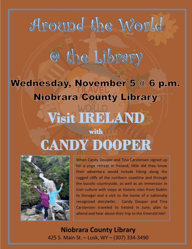 “Around the World: Ireland” will be presented on Wednesday, November 5 at 6 p.m. When Candy Dooper and Tina Carstensen signed up for a yoga retreat in Ireland, little did they know their adventure would include hiking along the rugged cliffs of the northern coastline and through the bucolic countryside, as well as an immersion in Irish culture with stops at historic sites from Dublin to Donegal and a visit to the home of a nationally recognized storyteller. Candy and Tina traveled to the Emerald Isle in June. Plan to attend!