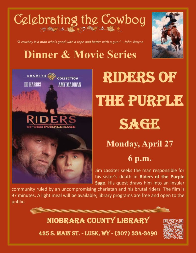 “Riders of the Purple Sage” is the final film in the “Celebrating Cowboys” Dinner & Movie series and will be shown on Monday, April 27 at 6 p.m. Jim Lassiter seeks the man responsible for his sister’s death. His quest draws him into an insular community ruled by an uncompromising charlatan and his brutal riders. The film is based on Zane Grey’s novel of the same name; a light meal will be available. Library programs are free and open to the public.