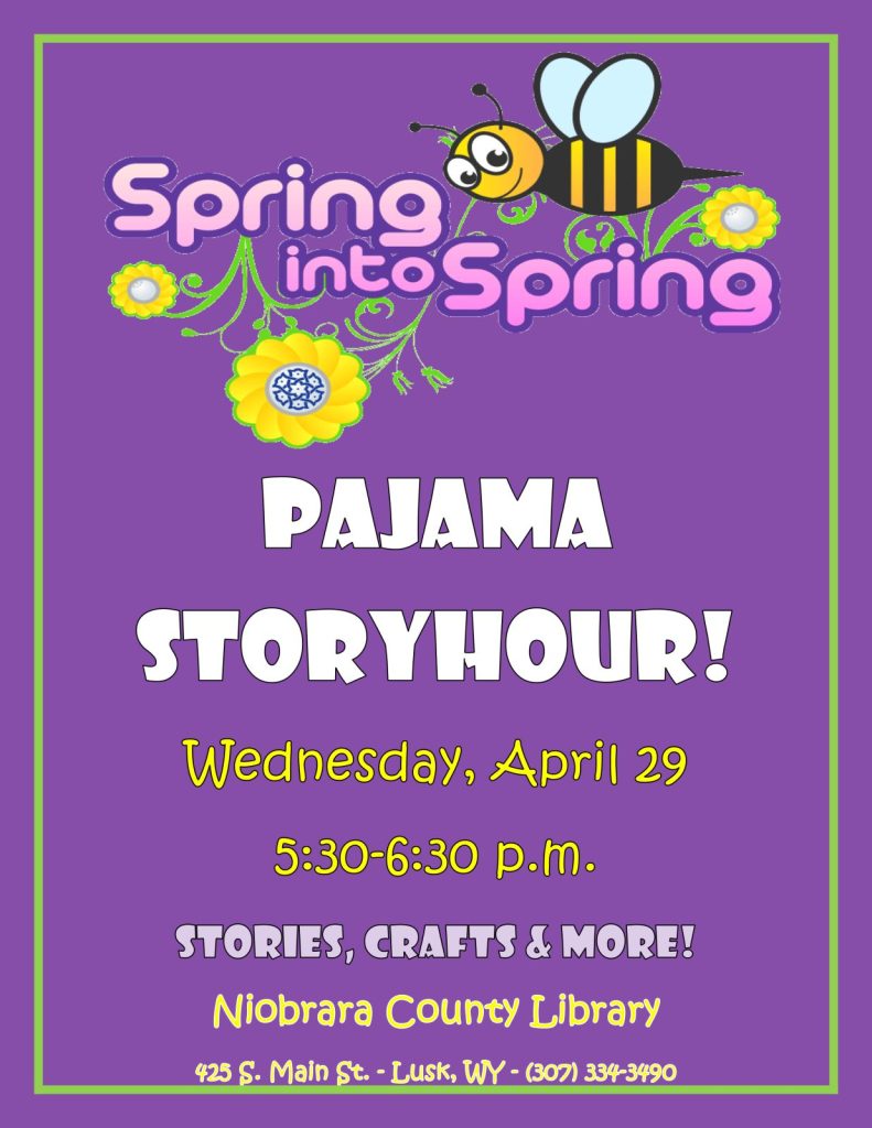 Pajama Storyhour on Wednesday, April 29 will feature all things spring! Plan to bring your children for this event which is held from 5:30-6:30 p.m.