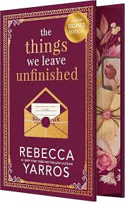 The deluxe edition of “The Things We Leave Unfinished” by Rebecca Yarros is now available. This book follows Georgia Stanton, who returns to her hometown after a painful divorce and discovers her great-grandmother Scarlett’s unfinished romance novel. As she collaborates with best-selling author Noah Harrison to complete the manuscript, their relationship develops alongside the historical love story of Scarlett and her World War II pilot, Jameson. “The Things We Leave Unfinished” is also available digitally.