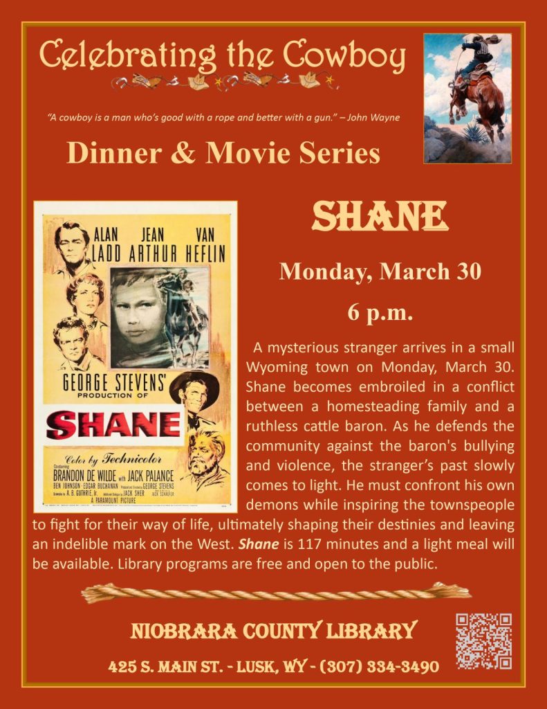 A mysterious stranger arrives in a small Wyoming town on Monday, March 30. Shane becomes embroiled in a conflict between a homesteading family and a ruthless cattle baron. As he defends the community against the baron’s bullying and violence, the stranger’s past slowly comes to light. He must confront his own demons while inspiring the townspeople to fight for their way of life, ultimately shaping their destinies and leaving an indelible mark on the West. Shane is117 minutes and a light meal will be available. Library programs are free and open to the public.