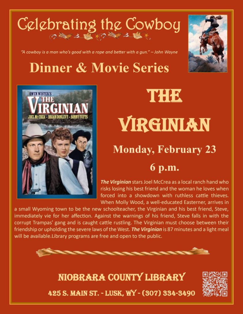 The Virginian stars Joel McCrea as a local ranch hand who risks losing his best friend and the woman he loves when forced into a showdown with ruthless cattle thieves. When Molly Wood, a well-educated Easterner, arrives in a small Wyoming town to be the new schoolteacher, the Virginian and his best friend, Steve, immediately vie for her affection. Against the warnings of his friend, Steve falls in with the corrupt Trampas’ gang and is caught cattle rustling. The Virginian must choose between their friendship or upholding the severe laws of the West. The Virginian is 87 minutes and a light meal will be available.Library programs are free and open to the public.