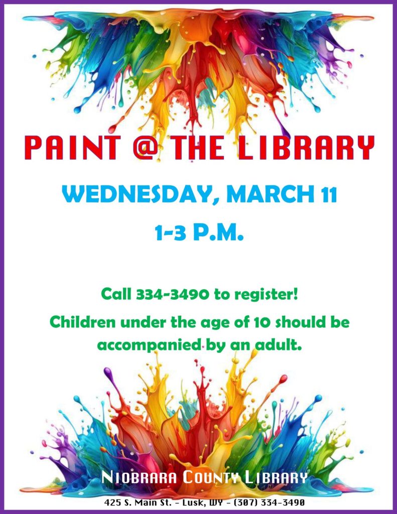 Artist Barb Orr has a fun Paint @ the Library planned for Wednesday, March 11 from 1-3 p.m. Watch for more details. Children under the age of 10 must be accompanied by an adult. Call the library at 307-334-3490 to reserve your space. Library programs are free and open to the public.