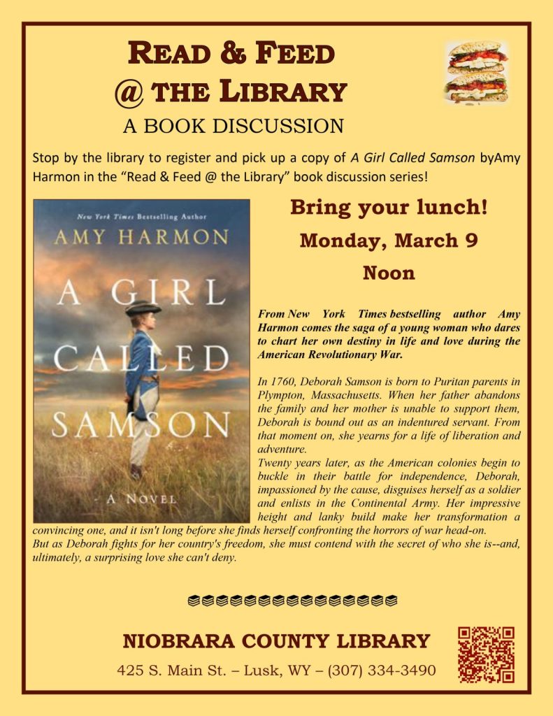 Two books have been chosen for the Winter Read and Feed. Monday, February 9 Cokie Roberts’ Founding Mothers will be discussed at noon at the library and Monday, March 9 A Girl Called Samson by Amy Harmon will be featured. Stop by the library to pick up a copy of the first book and then bring your lunch and discuss the books with friends.