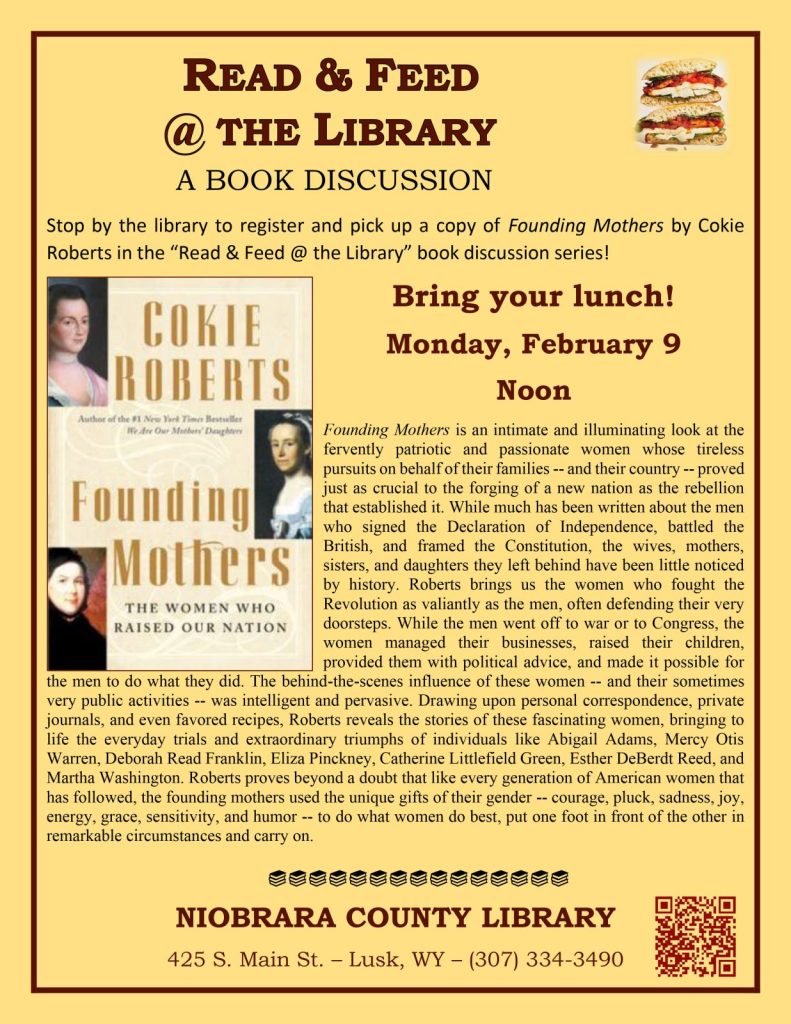 Two books have been chosen for the Winter Read and Feed. Monday, February 9 Cokie Roberts’ Founding Mothers will be discussed at noon at the library and Monday, March 9 A Girl Called Samson by Amy Harmon will be featured. Stop by the library to pick up a copy of the first book and then bring your lunch and discuss the books with friends.