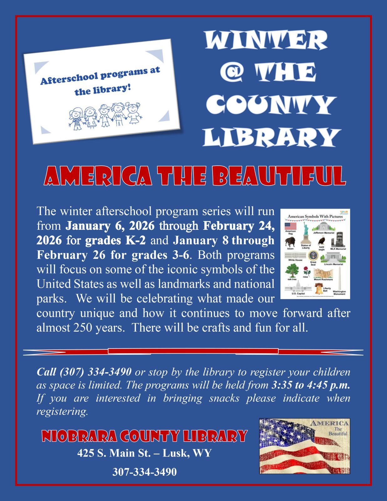 The winter afterschool program series will run from January 6, 2026 through February 24, 2026 for grades K-2 and January 8through February 26 for grades 3-6. Both programs will focus on some of the iconic symbols of the United States as well as landmarks and national parks. We will be celebrating what made our country […]