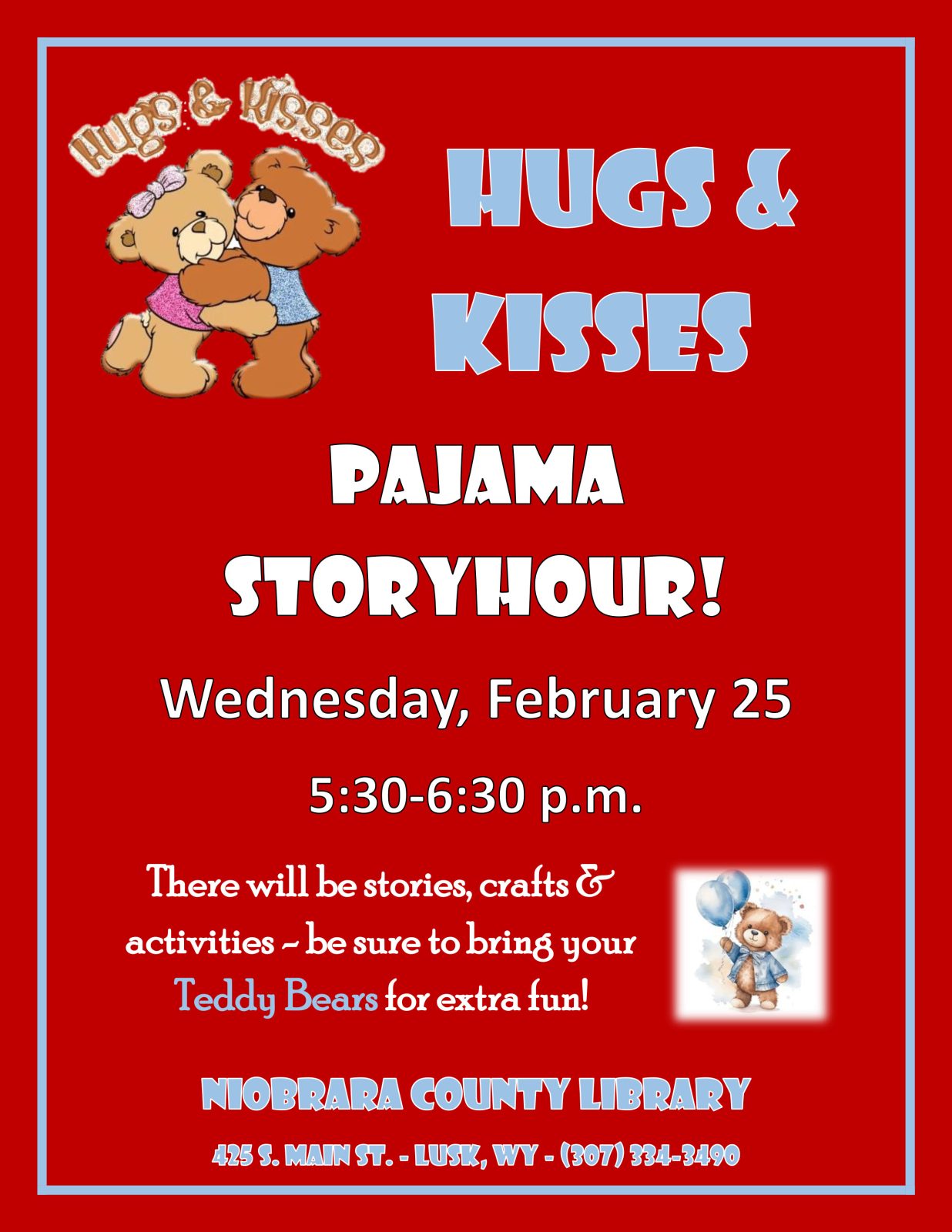 PAJAMA STORYHOUR – BRING YOUR TEDDY BEARS! Pajama Storyhour programs are planned for children on Wednesday, February 25, March 25 and April 29 from 5:30 to 6:30 p.m. Children will enjoy stories, crafts & activities and more!